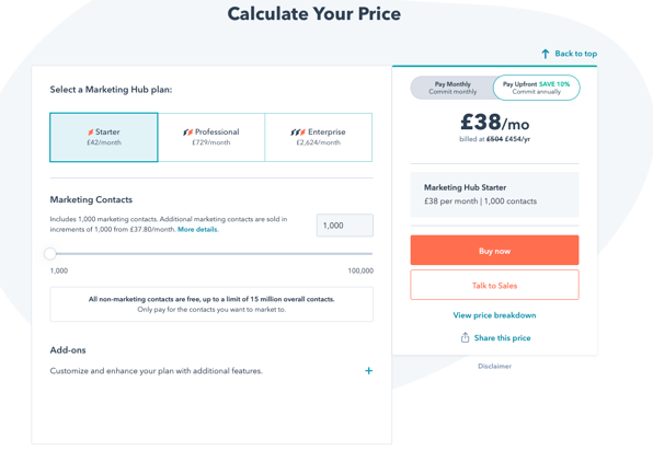 The reason we say this isn't a hidden cost (though it can still catch people out) is that there is a pricing calculator on the HubSpot Pricing page, where you put in your contact numbers and see how that affects the cost.