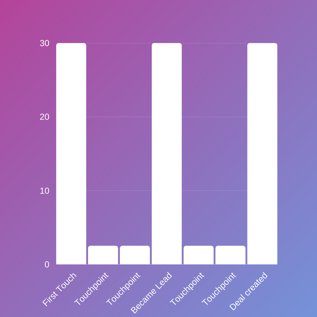 30% of the credit goes to first touch, 30% to lead creation, and another 30% to the action that leads to the prospect becoming an opportunity (or a deal being created). The remaining 10% is split equally among the actions that take place between these stages.